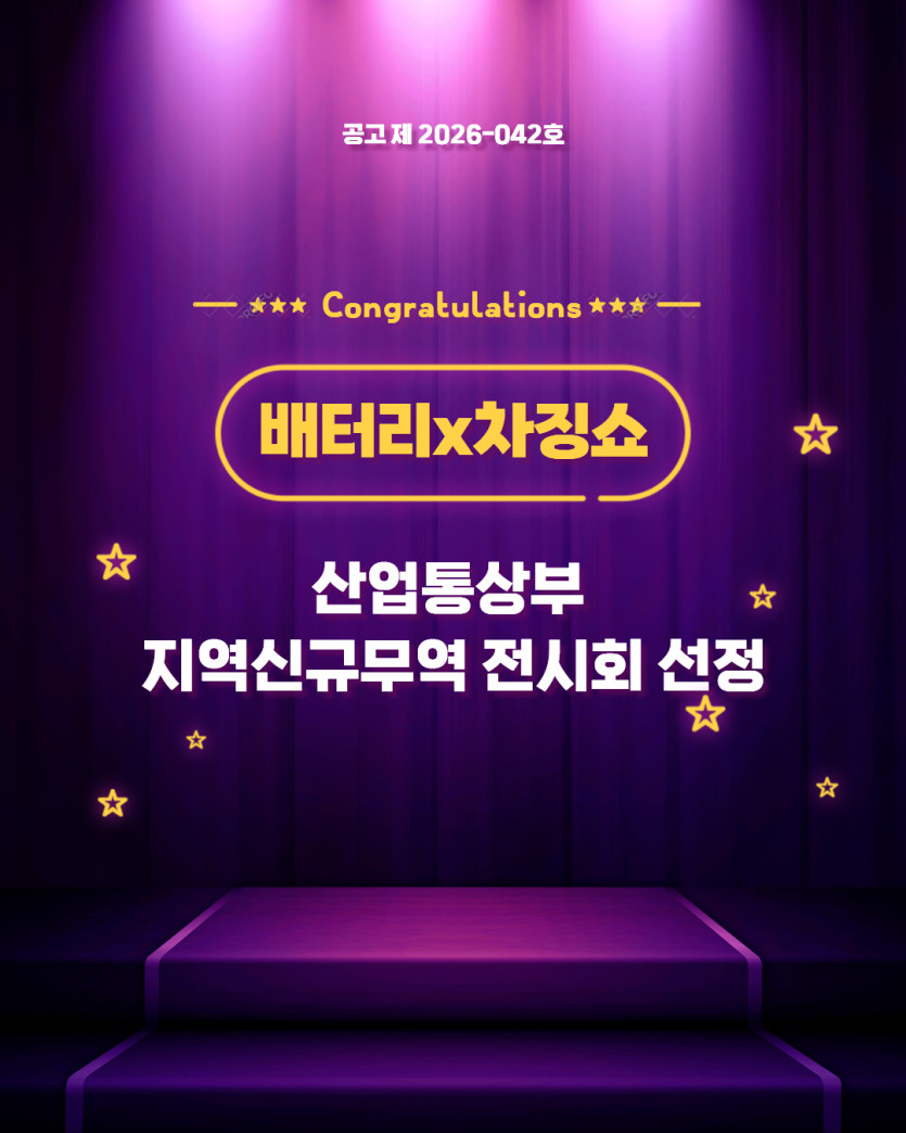 2026년 국내전시회 개최지원 대상사업(산업통상부 공고 제2026-042호)에 '2026 배터리차징쇼'가 선정되었습니다.